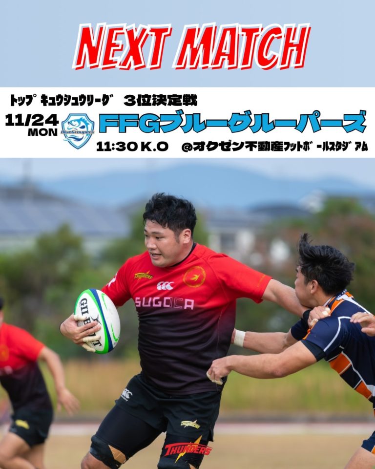 今週、24日(月・祝)にトップ九州リーグ3位決定戦、FFGブルーグルーパーズ さんとの試合が行われます。