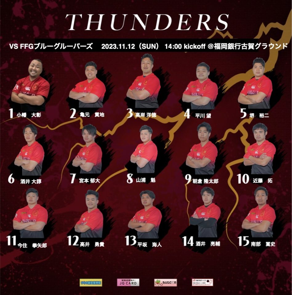 2023シーズンの結果といたしましては、トップキュウシュウAリーグ4位と昨年度より1つ順位を落とす結果となりました。また、目標としていた3地域社会人リーグ順位決定戦へ進むこともできず昨年に続き大変悔しい結果となりました。今シーズンはシーズン開始から現在まで終始様々なアクシデントに見舞われ試合を棄権する決断を下すような窮地に立たされる状況にもなりました。中には慣れないポジションでチームのためにシーズン全てを戦い抜いた選手も数名いました。社会人リーグとして仕事とラグビーを両立させながらここまで戦い抜いたことは選手たちにとってとても大きな経験になったと思います。同じリーグの他のチームより一足先にシーズンを終える悔しさを忘れず、どのチームよりも早く2024シーズンに向けて活動を始められることと捉え、来シーズンこそはトップキュウシュウAリーグで優勝し次のステージである3地域社会人順位決定戦へ出場できるように復活を心に刻み選手・スタッフ一同挑戦して参ります。2023−2024シーズンJR九州THUNDERSへの声援本当にありがとうございました。